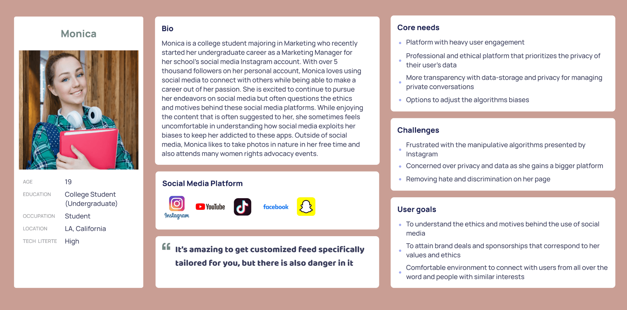 The overall theme that we chose for our project is the “Ethical Digital World”. To gain insight into the particular issues that relate to the question, “How do we design and change the digital world to make it more humane and ethical,” we conducted online secondary research where we examined online communities and articles. As the digital world gains more influence in our everyday lives, more concern is being raised over the safety and ethics of our privacy, data handling, and security. After discussing and researching with our group, we decided to focus on privacy and data handling of apps and social media platforms. Moreover, we decided to create ways in which users can become educated on the issues that surround the digital world and showcase information that is transparent with its user data. Nowadays, everyone is an online user and it is important for people to be aware and educated to make our digital world safe, yet engaging.