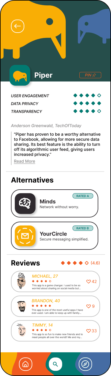Have a quick base of real, honest user reviews and data privacy ratings for your favorite apps at your fingertips. Check if your favorite social media is compromising your data, check user reviews, and find alternatives. Stay up to date on how your data is being used and stay ahead of leaks before they happen. Opt-in for personalized resources and feeds with articles and alternatives that we think you'd enjoy!